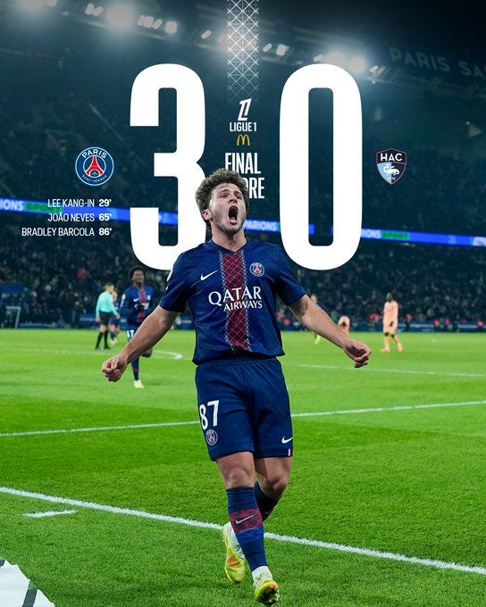 北京时间11月23日04:05,法甲联赛第13轮,巴黎圣日耳曼坐镇主场王子公园球场迎战勒阿弗尔。上半场,李刚仁破门,拉莫斯、姆巴耶失良机,舍瓦利耶门线神扑。易边再战,内维斯、巴尔科拉进球。最终巴黎3-0勒阿弗尔。积分榜方面,巴黎30分以2分优势领跑,勒阿弗尔14分第12。